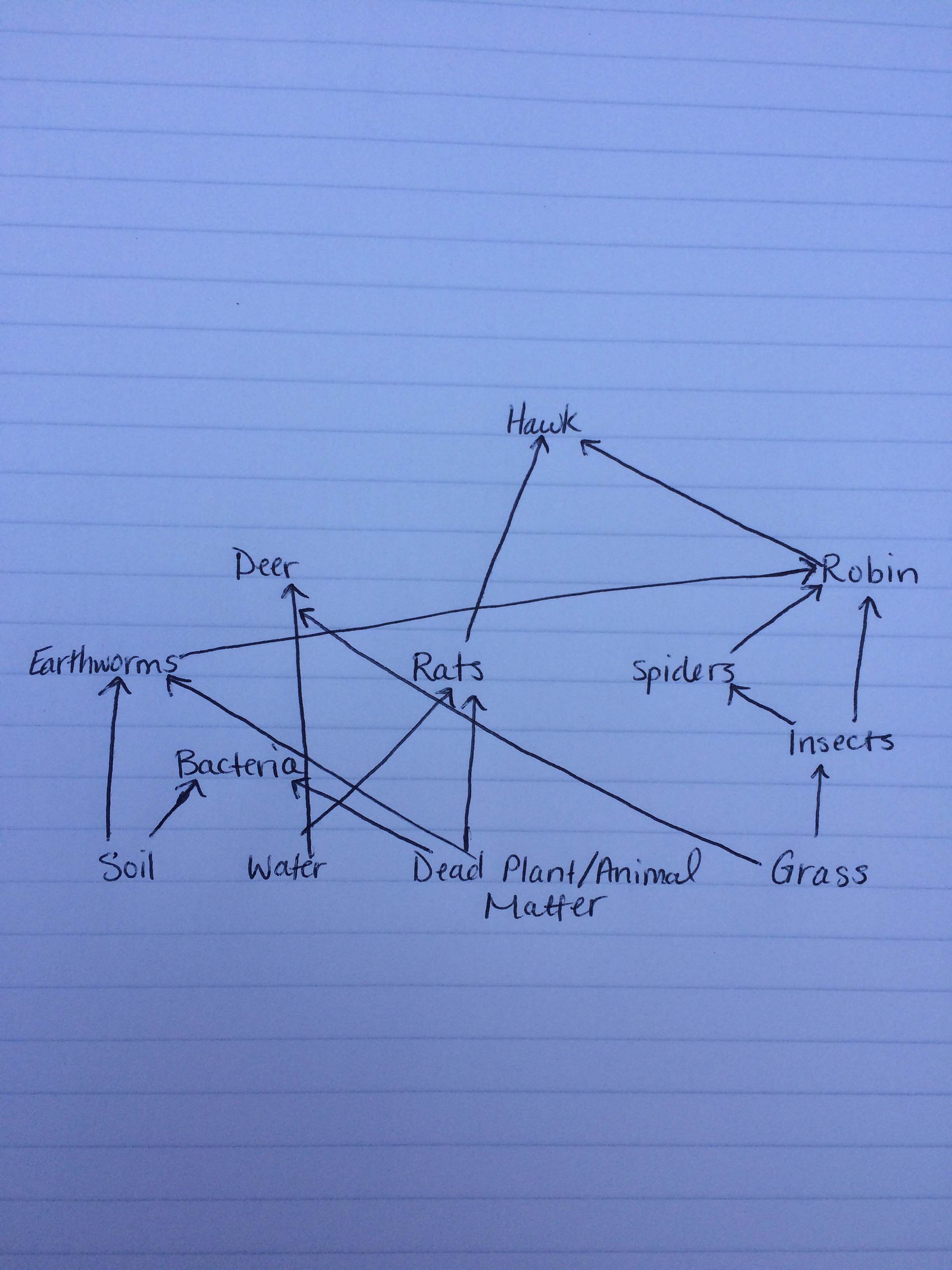 Each organism in this food web represents community in that they are all interacting with one another in a specific area, in this case, Transect 2. They demonstrate the idea of carrying capacity because through each interaction, the organisms are balancing each other out both in adaptations and population in that for an organism to be successful and reproduce, there can only be a certain number, otherwise there would be too much competition and the species could die off. Each represent trophic levels in that they all have different positions in the food chain. The plants at the bottom of the food web are the primary producers that the rest of the web relies on, while the dead matter are vital for the decomposers to survive and break down for the upper levels to use. The second trophic level, which includes the bacteria, insect, small herbivores and birds, feed on the primary producers for energy. The tertiary organisms feed on the secondary organisms for energy, and the pattern continues, illustrating the relationships between all the organisms within the transect.
