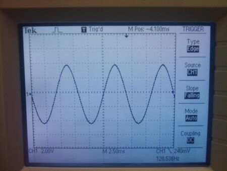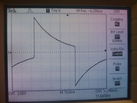 Coupling: There is an AC and a DC signal from the function generator. The oscilloscope offers the option to choose between them when displaying the wave function. AC coupling generates a wave function while DC coupling generates the same function but with a constant voltage added on. AC coupling makes the signal go through a capacitor in an RC circuit, which acts as a high pass filter and smooths away noiseSJK 22:06, 21 September 2010 (EDT)22:06, 21 September 2010 (EDT) The DC component is not necessarily noise. In fact, I'd usually think of noise as higher frequency component of a signal. Lower-frequency "noise" may be more often referred to as "drift" or "offset." that is left in with the DC coupling.