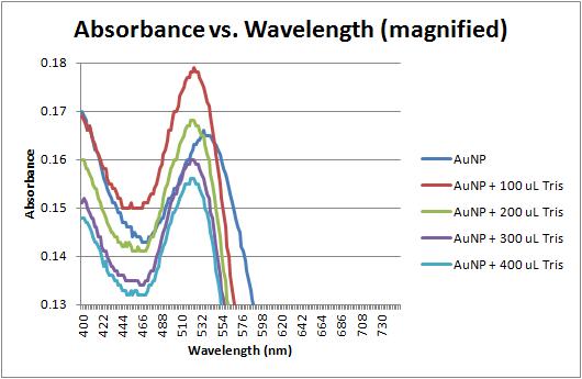 When Solution 1 test tube began to turn purple, it was removed from the oven and 100 uL of 5.02 mM tris (pH 10.1) was added to 1 mL of the solution. The solution then underwent UV VIS analysis. 100 uL of 5.02 mM tris was added two more times, and after both times UV VIS was also used to analysis the solution.