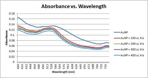 When Solution 1 test tube began to turn purple, it was removed from the oven and 100 uL of 5.02 mM tris (pH 10.1) was added to 1 mL of the solution. The solution then underwent UV VIS analysis. 100 uL of 5.02 mM tris was added two more times, and after both times UV VIS was also used to analysis the solution. ResultsAs seen during the previous day's experiment, purple fibers formed in the test tube after 1 hour. For solution 1, data was taken as soon as the purple solution began to form: