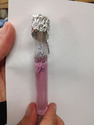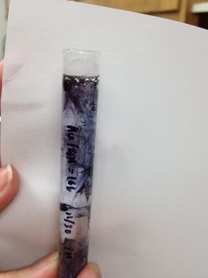 Each solution was repeated for a total of four test tubes. One test tube from each solution was kept in the oven at about 72 degrees Celsius for 3 hours. The remaining test tube from each solution was kept in an oven at about 72 degrees Celsius and then removed in half an hour intervals for ten minutes at each time. ResultsThe two test tubes both containing Solution One developed fibers over the course of 3 hours. The fibers in the test tube that remained in the oven were long and through out the entire solution. The fibers in the test tube that was removed from the oven every half hour aggregated to the top of the test tube. These findings are the expected result of the experiment. The two test tubes that contained Solution Two had varying results. The test tube that was removed from the oven every half hour did not have any changes. It was still a clear solution. This was not an expected result. The second test tube that remained in the oven formed a purple solution with no fibers. This was not the expected result. Au/BSA = 166, taken out of the oven every 30 minutes