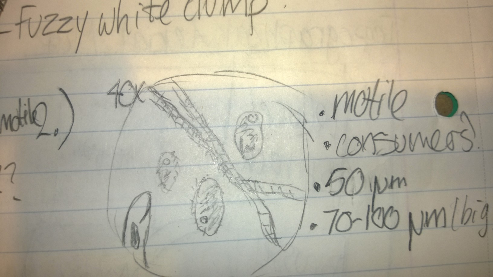 Sample 2 contained a variety of organisms, including colpidium, at least two different types of paramecia, and an organism I suspected to be some kind of worm. The colpidium were roughly 50 micrometers, and the paramecia ranged from 70-100 micrometers.