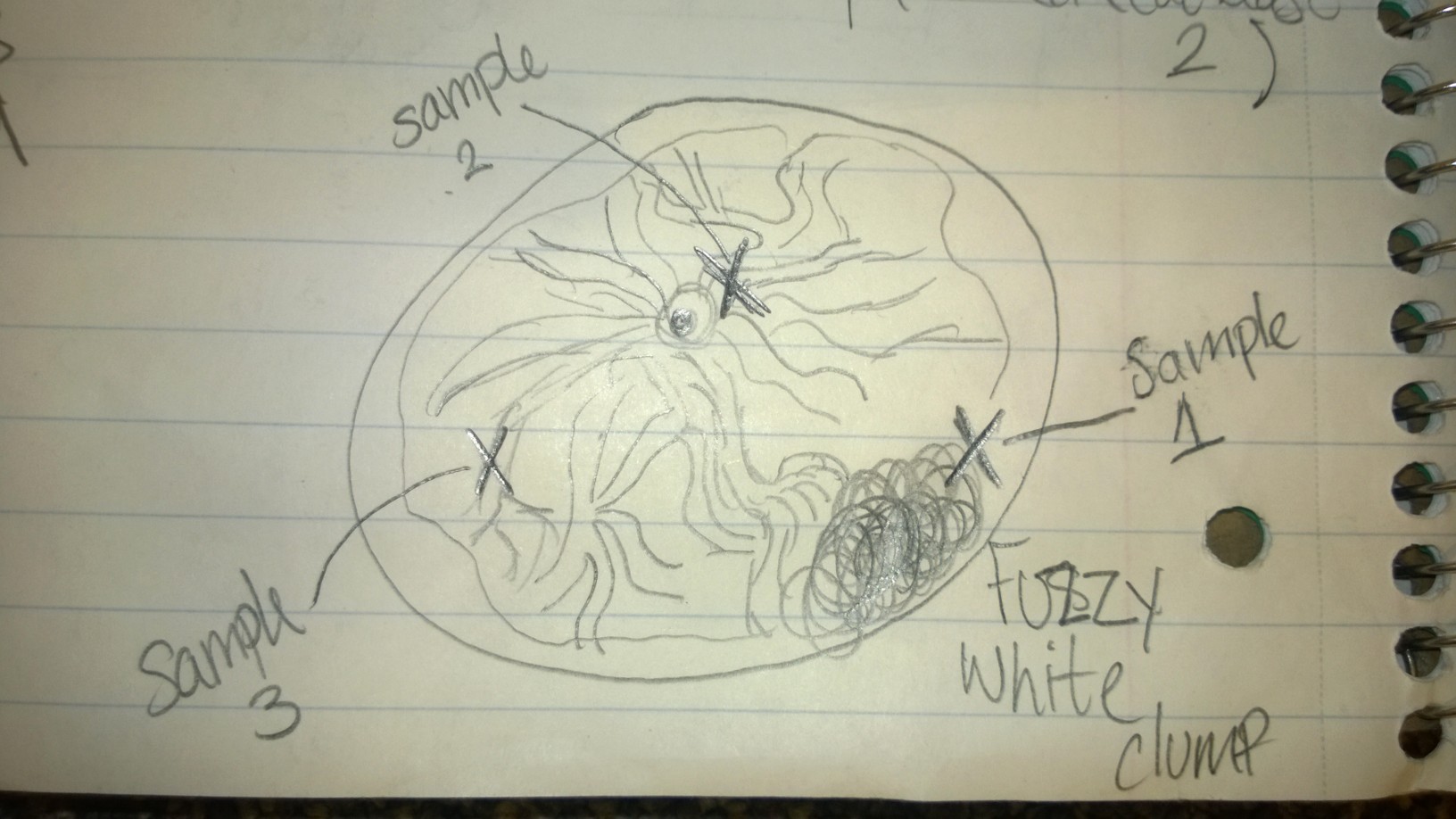 Below is a diagram of the culture as seen from above, and each X represents where a specific sample was taken from.