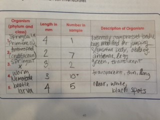 Procedure 3: Break down the Berlese Funnel and pour the top 10-15 mL of liquid and organisms into one petri dish, and pour the remaining liquid into another dish. Probe around with a pencil to better see the organisms, as they will be mixed with debris. Observe the dishes with a dissecting scope, and identify the class of any arthropods you observe. Most will be insects, so you may use the Dichotomous key to identify insects. Identify at least five invertebrates, and document their descriptions into a table.
