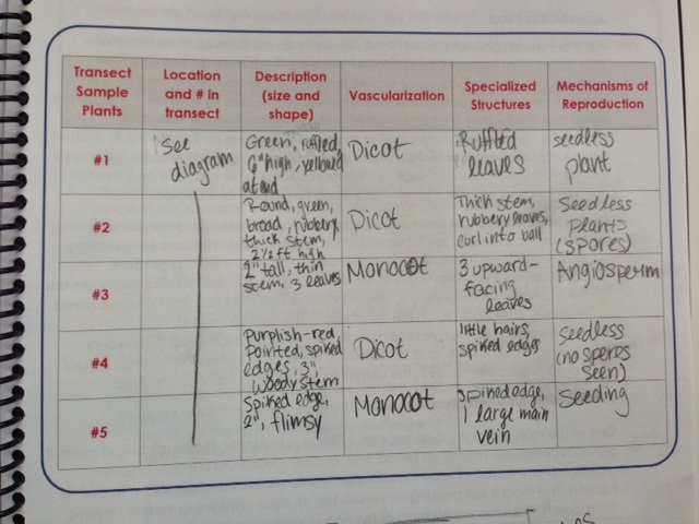 This table shows the observations made about each plant sample taken from the transect. I believe sample #1 to be of the genus Brassica. Sample #2 is also the genus Brassica. Sample #3 is the genus Trefolium. Sample #4 is Lycophyta. Sample #5 is Lactuca.
