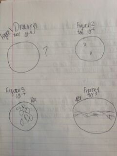 The colonies picked for characterization were 10^-3 with tetracycline (colony A), 10^-5 with tetracycline (colony B), 10^-7 without tetracycline(colony C), and 10^-3 without tetracycline(colony D). Drawings of each sample drawn under a microscope can be seen below. There is no drawing for colony A because it wasn't able to be found under a microscope.