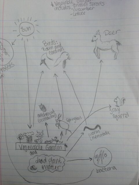 The vegetables growing in the garden are a clear source of food for the animals listed above, with exception of the dog. This biotic factor attracts the animals. The fertile soil would likely have worms in it, which is the attraction to the robin and cardinal, in addition to the seeds produced by the plants and scattered by humans. The dog was there as a human's pet; the garden is taken care of by humans, and someone brought along their dog. As this is a highly residential area, seeing a dog is not uncommon. Squirrels would find many materials to make a nest with as there are woodchips and bushes scattered around the transect. Deer, much to the planters' dismay, are attracted by the well-grown and large vegetables as a reliable food source.