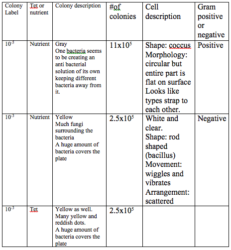 -> The effect of tetracycline on the total number of bacteria based on our plates seems to eliminate anything living. The only exception was for 10^-3 with tetracycline which had a good amount of fungi and bacteria. This could be a bacteria that was immune to tetracycline's killing abilities or a possible mix up in plates. Maybe the plate never had tetracycline... that is a possibility and could affect our readings of the results. The only way to be sure would be to redo the plates part of the experiment.