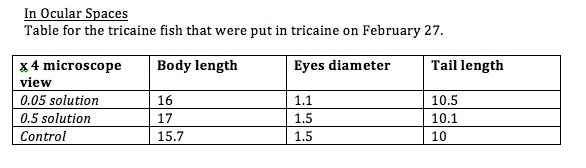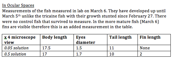 March 6---> now we use the tricaine fish to do measurements. Tricaine stunts growth so with measurements we are seeing the process of growth. Below is the amount of fish still alive and the charts on measurements of the fish.