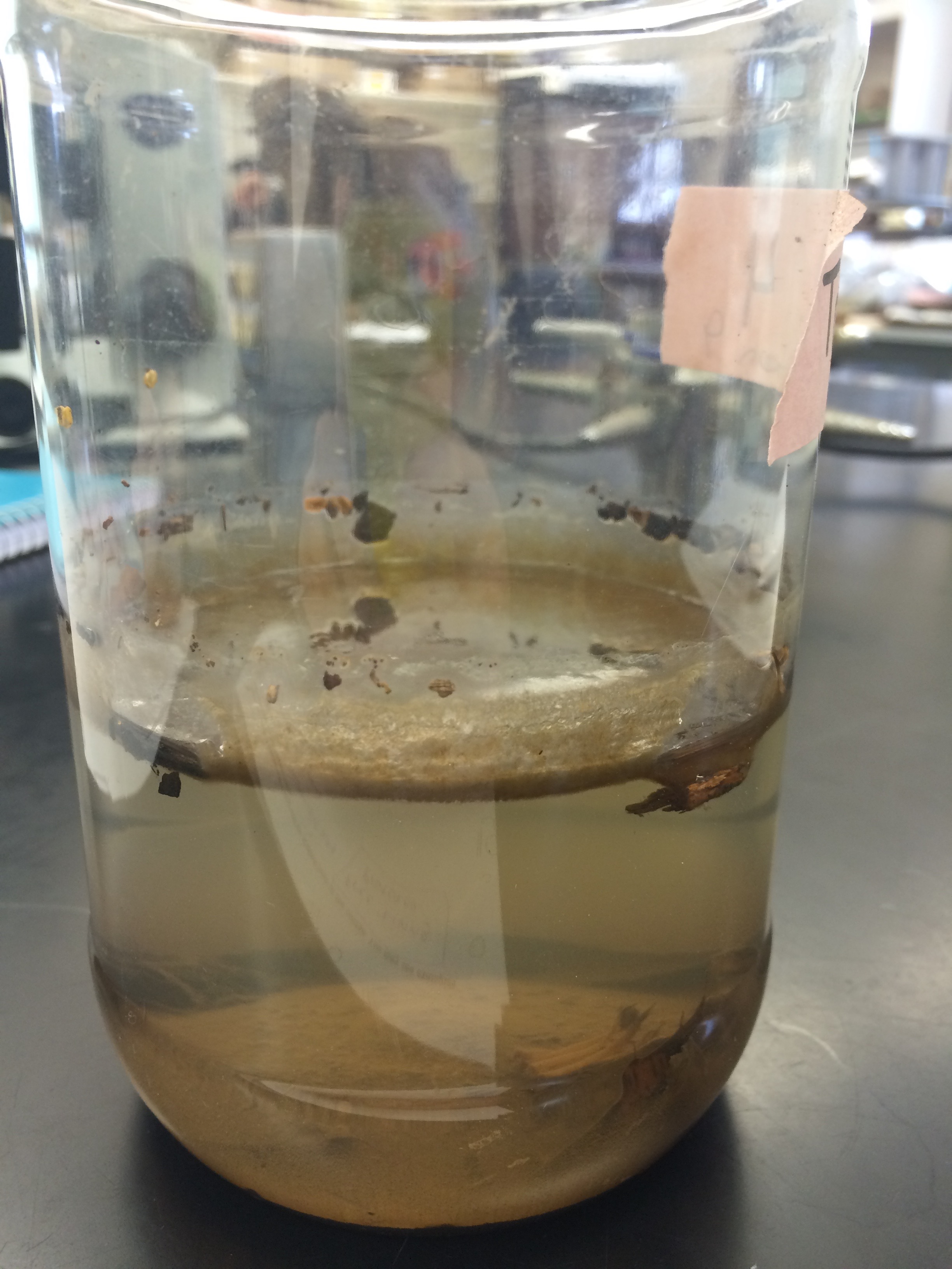 Our Hay Infusion was filled halfway with brown dirty water. There was some dead plant life sitting at the bottom on top of sand or dirt that had collected at the bottom of the jar. All of the plant life looked destroyed. There was a sort of film over the surface of the water. We took samples from the top, middle and bottom of the Hay Infusion and viewed the samples under a microscope.