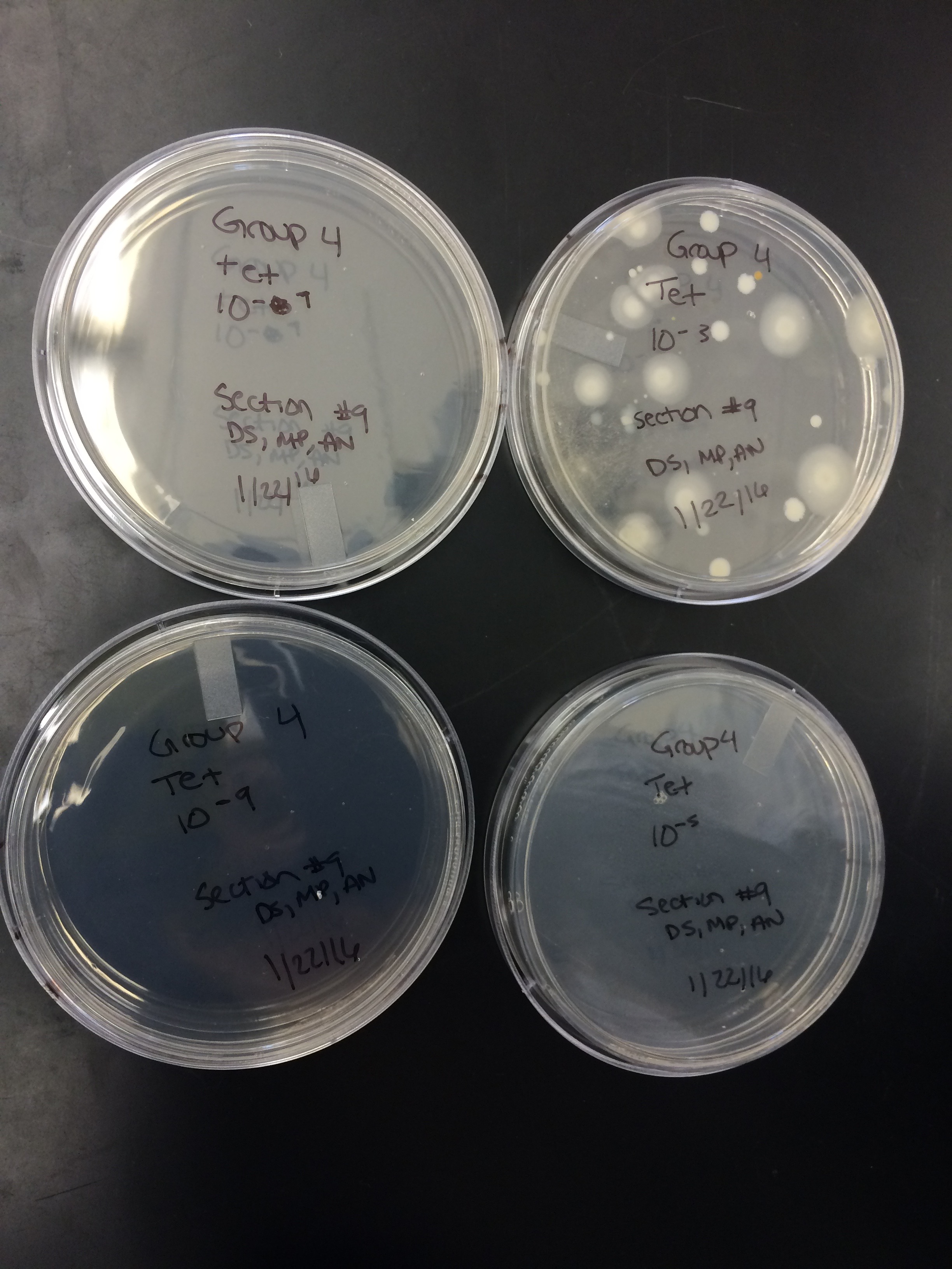 It is simple to see that the bacterial growth was significantly inhibited by the tetracycline. One Tetracycline plate, 10^-3, the one with the least amount of antibiotic, showed bacteria growth. This plate, however, only grew 40 colonies of bacteria, which is much less in comparison  to the nutrient agar plates. One of the nutrient agar plates grew up to 1 million colonies.