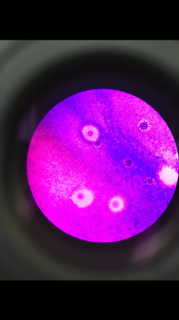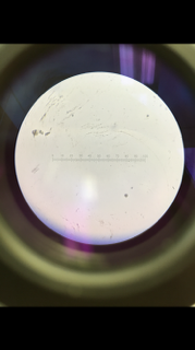 Gram Stain First a loop was sterilized over a bunsen burner flame and then cooled in order to pick up a small amount of bacterial growth from the agar plate. The bacteria was then smeared onto a slide and a drop of water was added. A circle was then drawn on the opposite side of the side labeled to mark where the sample was located. The water was then evaporated by passing the slid through the flame using tongs with the bacterial sample face up. Once cooled, a drop of crystal violet was put on top, left to stand for a minute, and then rinsed with water. The previous steps were repeated but with Gram Iodine. Then a drop of 95% alcohol was applied for 15 seconds and then rinsed. The remaining water on the slide was then removed with a kimwipe.