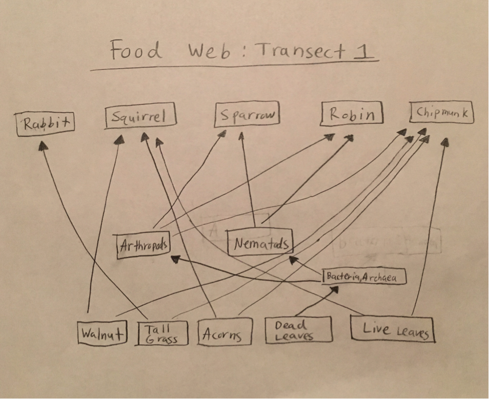 Due to the harsh cold that inhabited transect one during the weeks of data collection, in addition to the multiple snowfalls, no vertebrates other than squirrels were observed. However, based on the research of the biome that the transect falls in it is expected that many vertebrates inhabited the transect at a given time. The large presence of nuts and acorns indicates that squirrels and chipmunks do play their part in the ecosystem in the transect. According to the birds and the rabbits, it can be inferred that these vertebrates play their part in the transect as well considering they are organisms that are often observed around campus. However, there is no hard evidence to support the existence of these vertebrates in transect one.