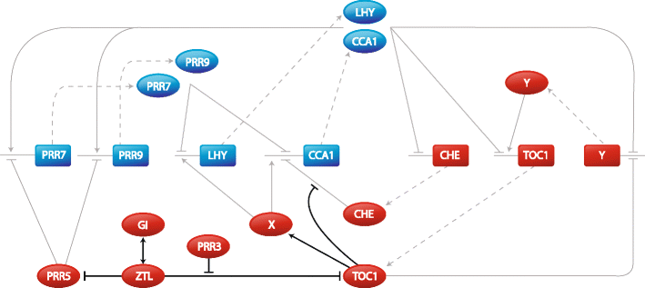 ![]() Some of the feedback loops that form the Arabidopsis circadian clock. See [1] for more detail |