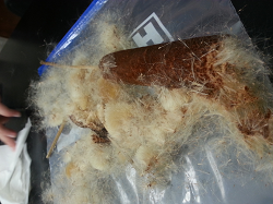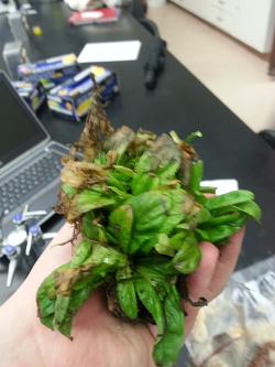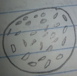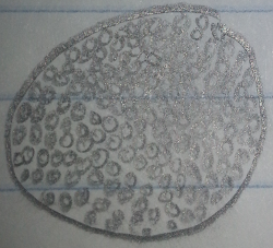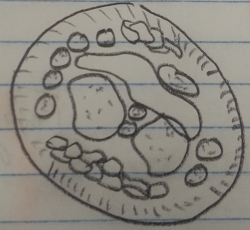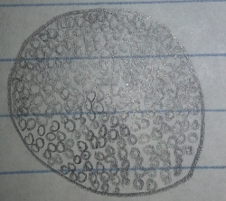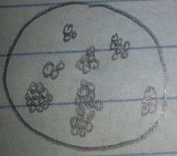 Observations of Hay Infusion- The infusion smelled like mold or old seafood, an overall unpleasant odor. There was some algae or other plant growth on the surface of the water and under it creating a whitish film. Overall the water near the top was very cloudy. There were two small sprouts growing out of seeds that were on twigs above the water surface. The middle layer of water was transparent, but colored like weak tea. The bottom of the jar contained lots of sediment from the fallen leaves and other organic debris.