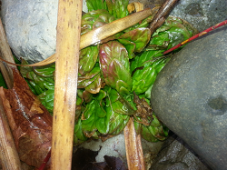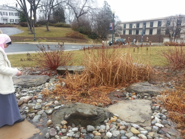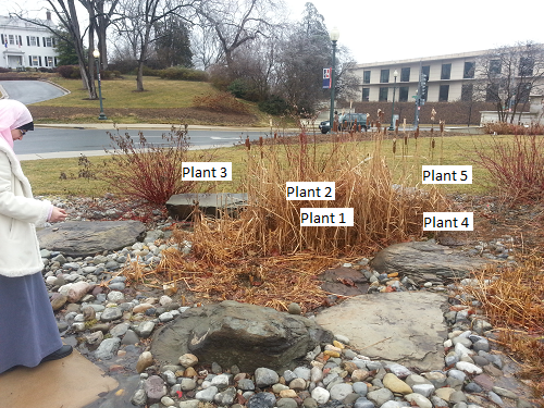 Abiotic components: About half the plot was in shade at that time of the day, about 1:15pm. The soil near the cattail was very wet and damp, the area appears to be a runoff area as there is a drain located right outside the limits of the plot. Several different types of rocks appeared in the area. When facing Massachusetts Avenue there was a patch of very small, only a few inches across, rocks that were surrounding two larger boulders on the lower left hand side of the plot. The area closer to Kogod will be the lower side, the side closer to Massachusetts Avenue the upper side. To the right of this small stone patch was another stone patch, this time with rocks about the size of two or three fists. Three large, flat boulders appeared in this area. There is lots of exposed soil near the stone patches.