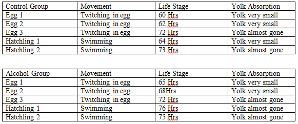 In the control group 1 egg died, leaving 19 zebrafish alive. 10 hatched while 9 remained in their eggs. In the alcohol group 2 eggs died, leaving 18 zebrafish alive. 10 hatched while 8 remained in their eggs.