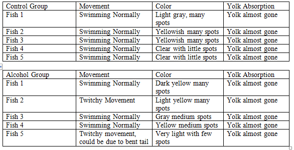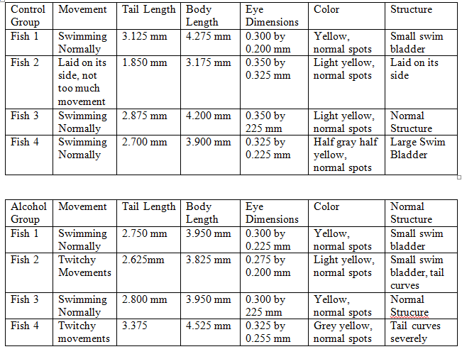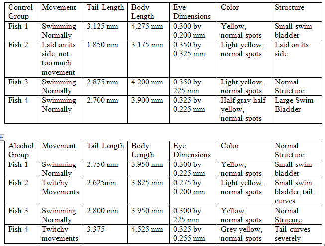 Another factor that could have shown a difference was the rate of abnormalities. However, several fish from each group had bent or curved tails as well as abnormalities of the swim bladder with the total being 5 control fish as being not structurally normal and 7 alcohol fish being not structurally normal. Seven to five is not enough data to show that the alcohol made a difference, obviously structural abnormalities are a natural process for it to affect both groups.