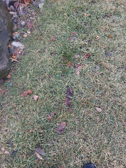 Biotic Components: There is a triangle of grass in the upper left side of the plot that takes up about ¼ of the plot. There is very little besides grass in this area in terms of life. On the very left border of the plot and in the middle of the plot on the grass/dirt border there are two red barked shrubs that did not have any leaves. On the middle to the right hand side of the plot in the stone/dirt area there is a small thicket of cattails. Among the cattails there are a few small plants that may be weeds. To the right of the cattails are a several very small plants that hug the ground. On several of the rocks either a moss or algae is growing, likely due to the large amounts of water the area gets. Lots of organic matter, such as dropped leaves, sticks, or other dead plant material, litter the ground in the stone area and among the cattails.