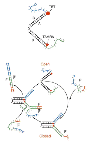 - Yurke B, Turberfield AJ, Mills AP Jr, Simmel FC, and Neumann JL. A DNA-fuelled molecular machine made of DNA. Nature. 2000 Aug 10;406(6796):605-8. DOI:10.1038/35020524 |