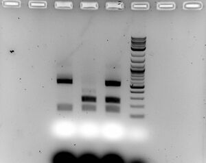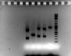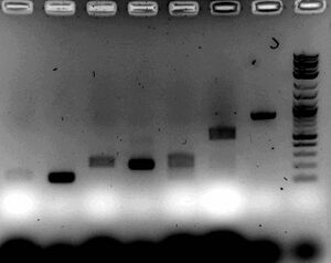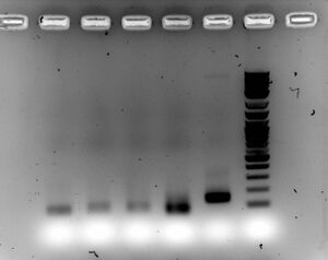 - Ran 1.5% gel for 30 minutes at 100V with samples (5ul sample with 2ul of loading dye)