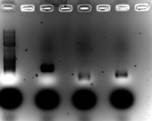 - Ran 1% gel for 30 minutes at 95V with samples (5ul sample with 2ul of loading dye)