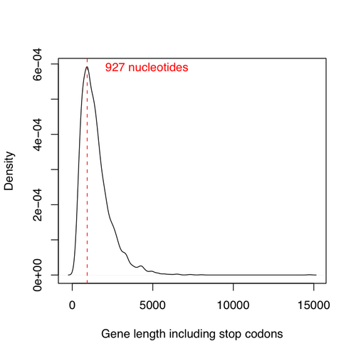 After loading there are 5883 protein coding genes in the database. The smallest gene is 51 nucleotides long including stop codon, the longest gene is 14733 nucleotides long including stop codon. The respective mean gene length and standard deviation is 1489.83528811831 and 1147.7776369172 nucleotides including stop codons.