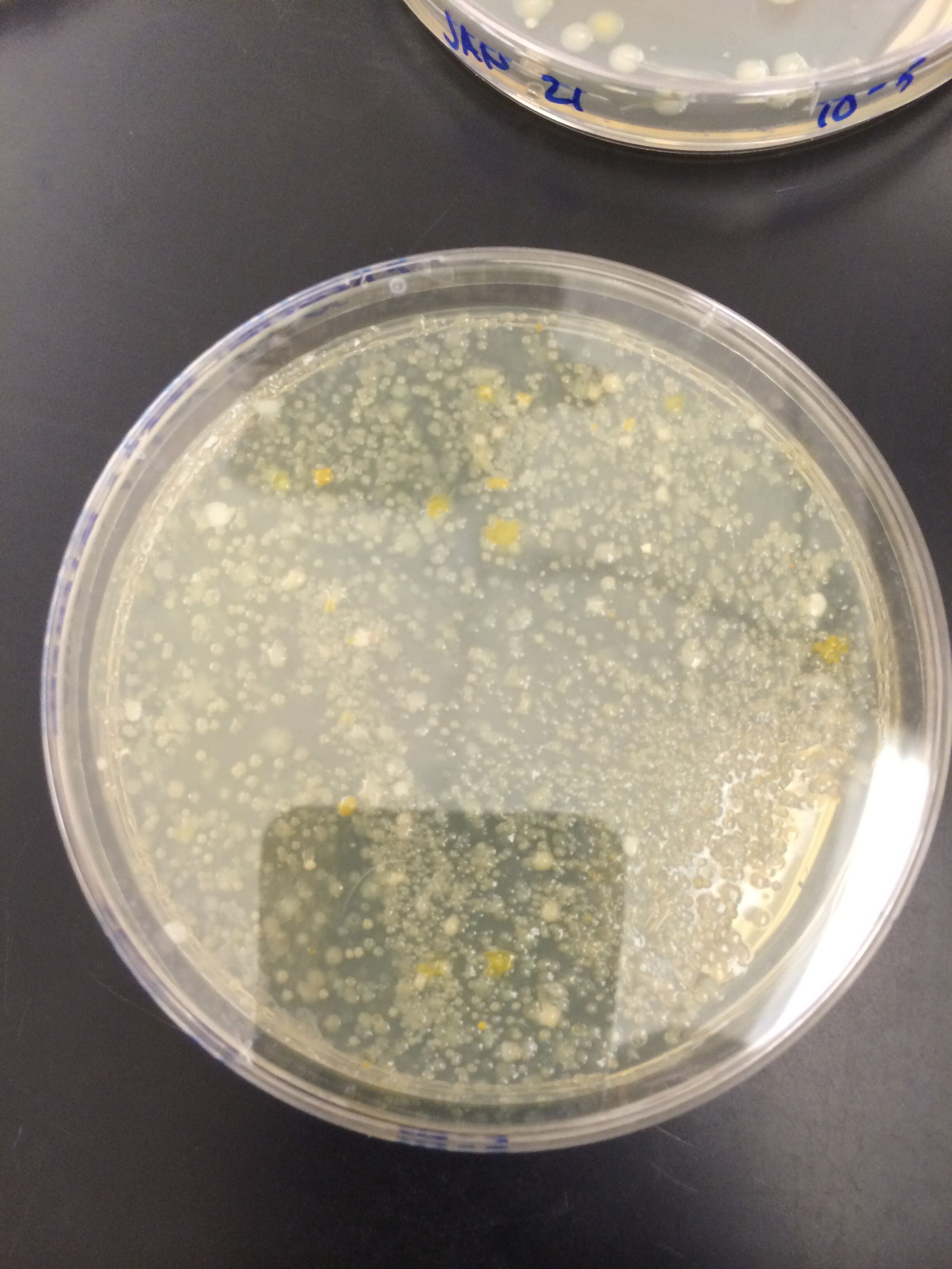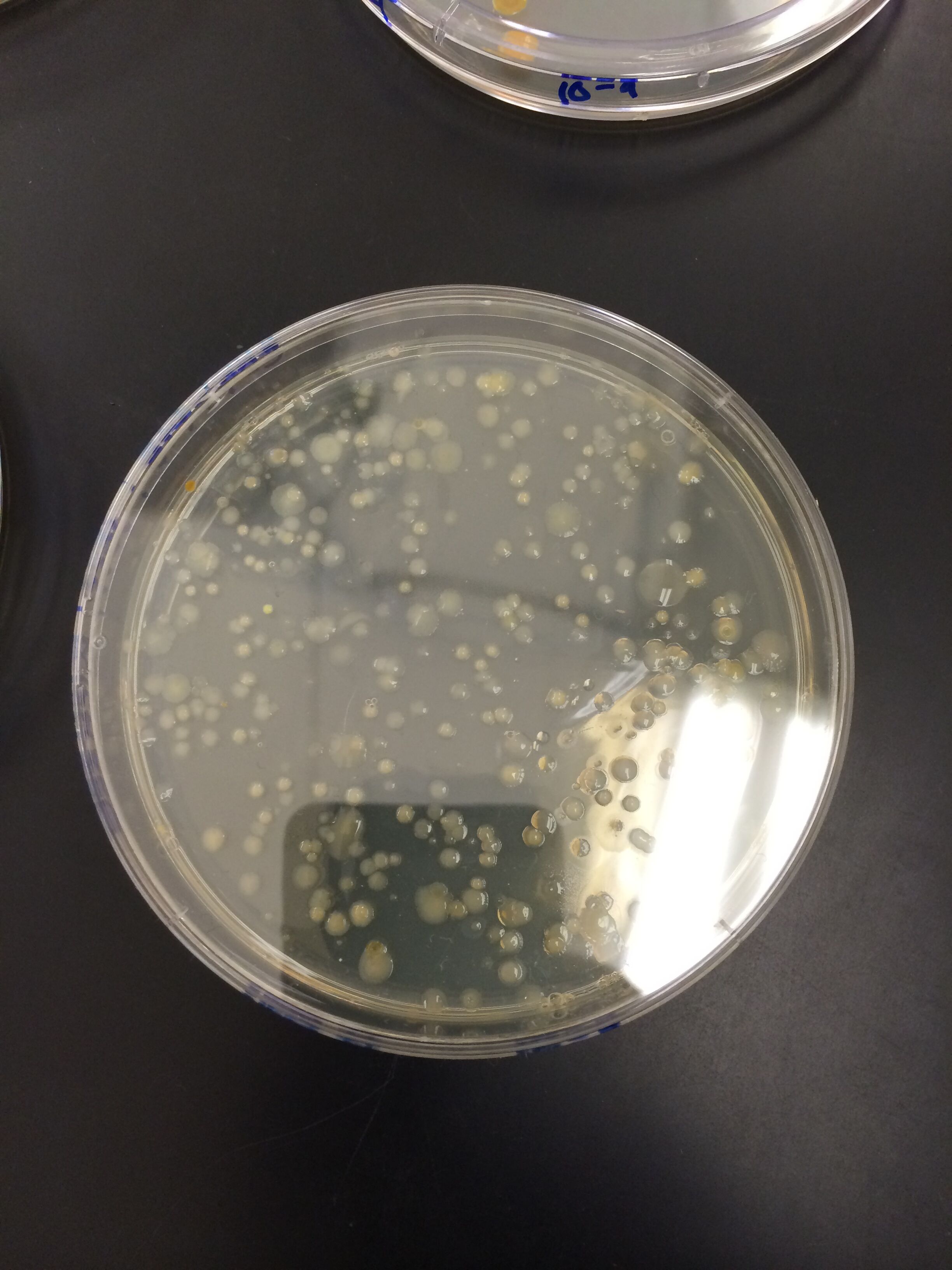 Materials and Methods Before starting the experiment, we observed the Hay infusion culture. We took pictures of it and noted any differences in smell or appearance from the previous week. Too start the experiment, we took the pea tree dishes that have been growing for a week and counted the bacterial colonies. To get a rough estimate on the amount of colonies on the pea tree dishes, we counted ten percent of the dish and multiplied that number by ten to get a final number. We then multiplied it by a conversion factor to get colonies/mL. The data of the serial dilutions were recorded then in our lab notebook. We then chose two nutrient Agar plates and two tetracycline plates, that were made last week, and observed the under a microscope. One from each sample was a wet mount and 1 from each sample was a gram stain.