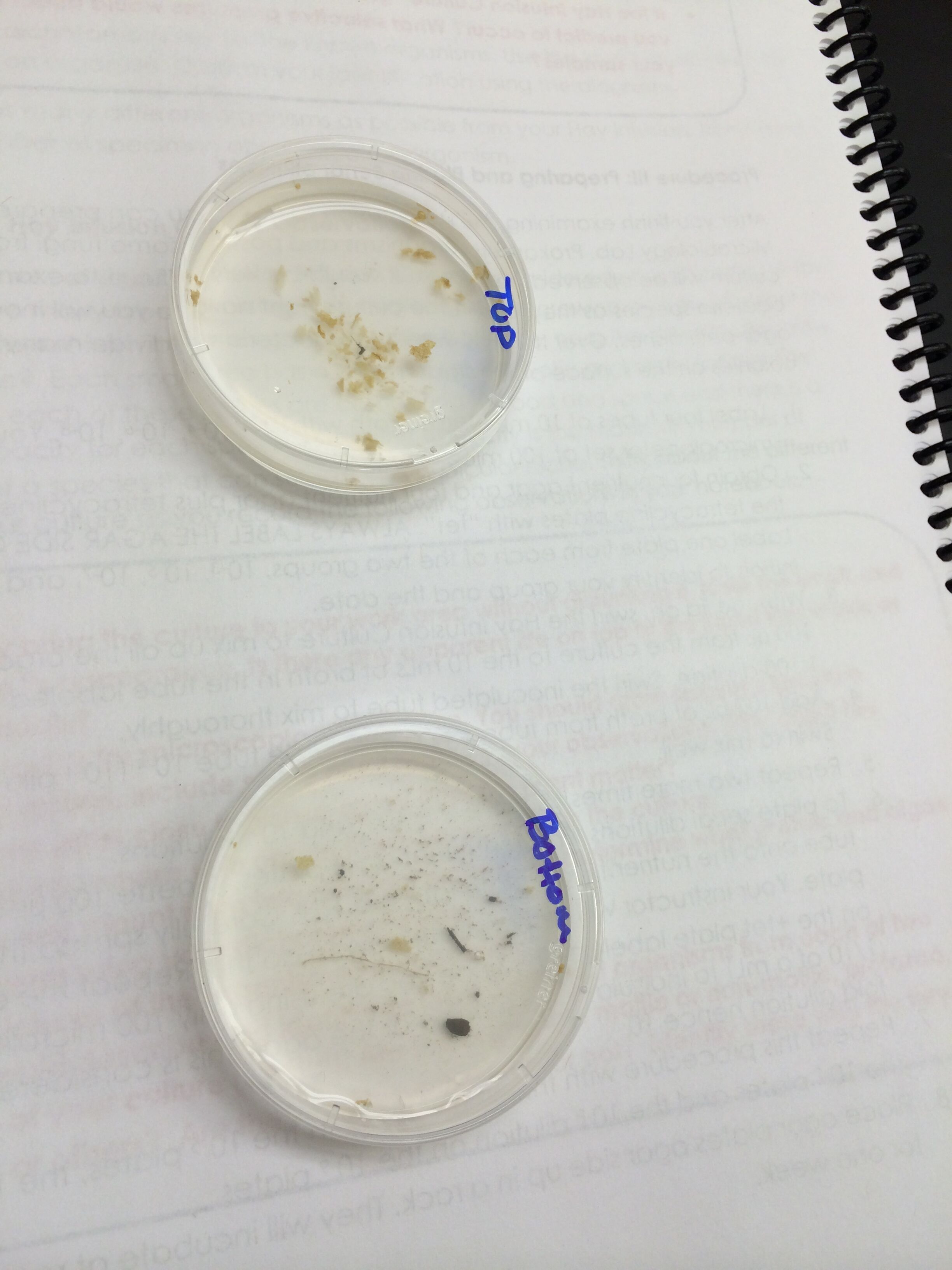 The sample used in the experiment was collected in a test tube from the community garden. the specific type of ecosystem used was "Farmland". We then mixed dried milk powder with 500 ml of water in a jar. Ten grams of the sample was dissolved in the dried milk and water mixture to create a Hay infusion culture. The Hay infusion culture was then left alone, with the Top off, for a week. The next week we took samples from the top and bottom of the Hay infusion culture. These sample were put on a wet mount then examined under the microscope, en-search for Protists. the Protists were identified and recorded. We then serial diluted a sample of the Hay infusion culture and placed 3 sample of it in a pea tree dish to sit and grow life, for a week.