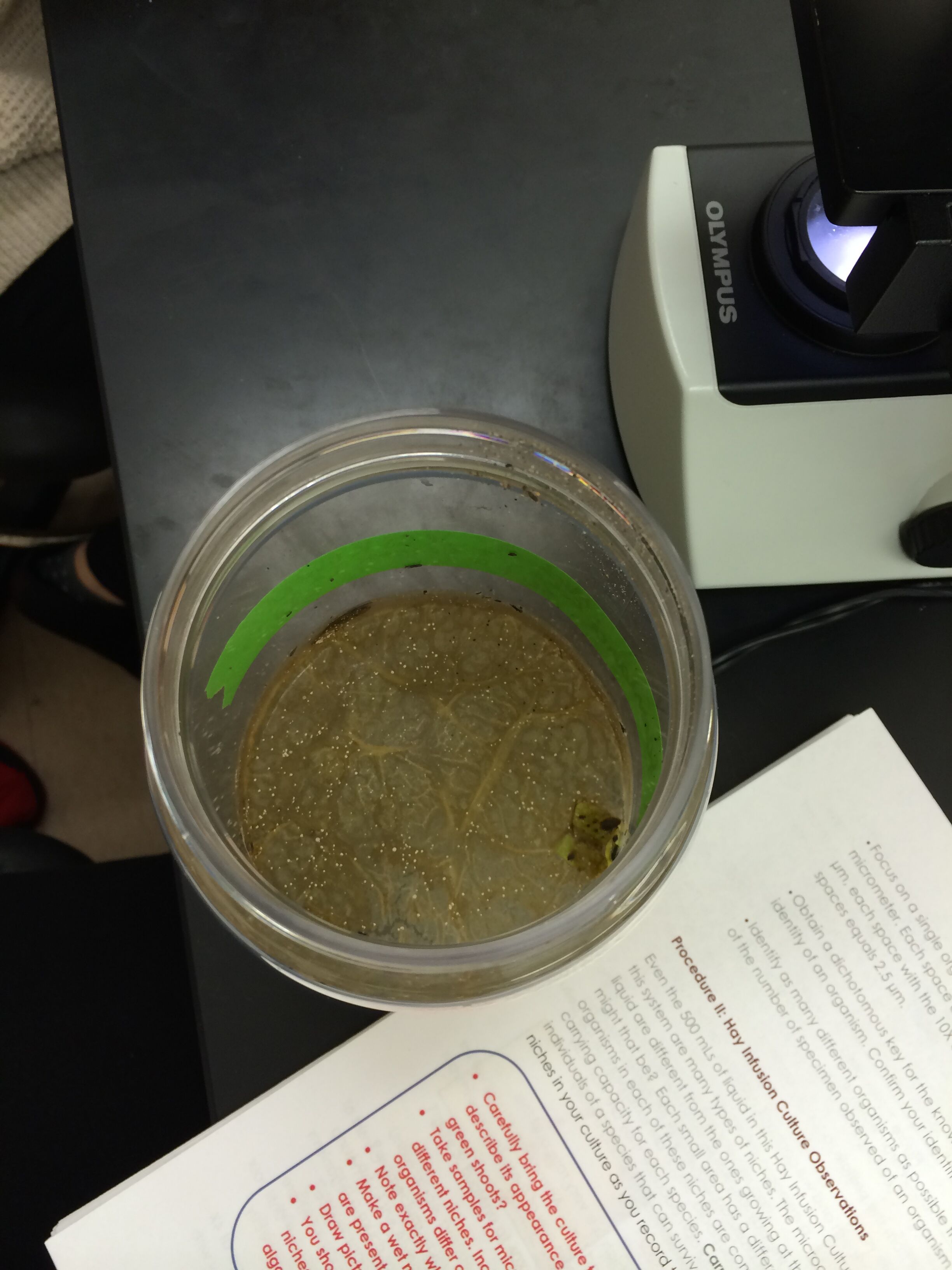 The Hay Infusion culture smelled the same as it did the previous week. There was a thin film of brown dirt on the top of the culture.