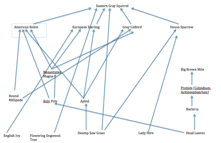 There was no variation in the phylum of organisms that we found in our transect, however, there was variation in the class that these organisms belonged to. All five organisms were part of the arthropoda phylum. This particular phylum was most common likely due to the fact the phylum itself is so broad and diverse, thus collecting in numbers. Features typical to organisms in this phylum include their segmented bodies, exoskeletons, jointed legs, and numerous appendages. Temperate forests tend to sustain arthropods due to the crucial role that they play in the ecosystem. Arthropods can be vital decomposers and significant in flower pollination and water infiltration (Freeman et. al., 2014). The most common class of arthropoda in our sample were the arachnida. The most common organism was the big brown mite and the least common were the aphid and the roly poly. All of the arthropods we identified were bilaterally symmetrical and tripoblastic, meaning that they had three germ layers- the mesoderm, endoderm, and ectoderm. My hypothesis was partially supported, although there was no organism in the annelida phylum identified. The organisms were all fairly tiny, ranging from 1 mm to 10 mm. The average size was 4.2 mm. In regards to the food web, it demonstrates a community as these various species interact with and rely on each other for survival due to nutrients that they can offer. This community is affected by the resources that its ecosystem can provide, as each species’ carrying capacity (or in other words, their individual maximum population sizes) must be sustained by their environment. Lastly, each individual species represented in the web bears its own trophic level, illustrating its position in the food chain and collectively, illustrating the idea that one organism must be consumed by another and thus die to propel the other’s survival.