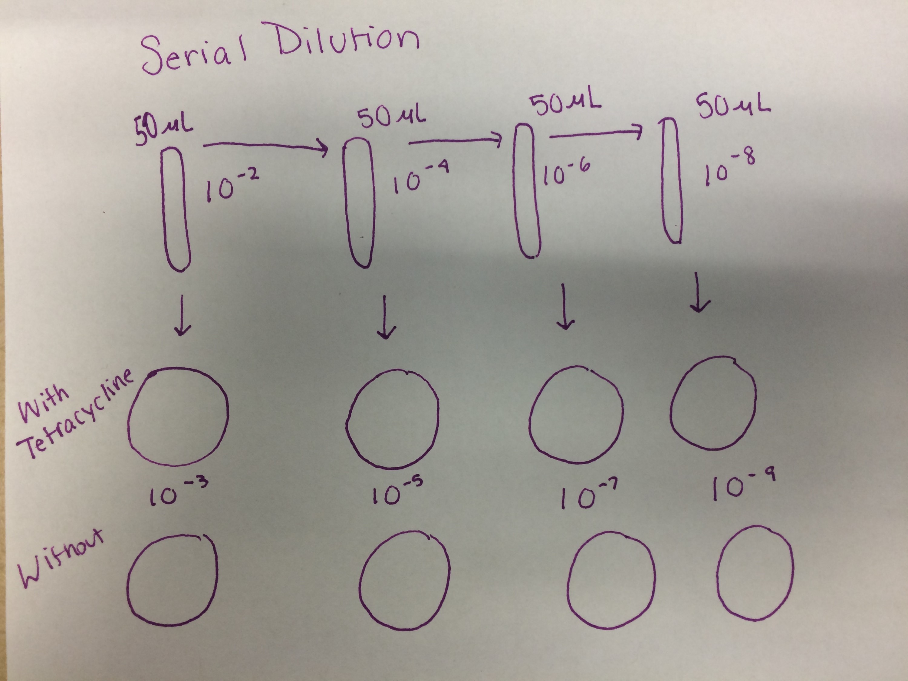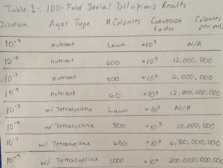 Methods: Before beginning the serial dilution, two samples of the hay infusion from the stream was extracted from the top of the jar and two from the bottom and prepared on wet mount slides. They were analyzed under the microscope through 10x and 40x lenses and the eukaryotes on the slides were identified using a dichotomous key. Their sizes were recorded. Then, the hay infusion was shaken in the jar to begin the serial dilution. To begin this, 50μL of the Hay Infusion was added to 5mL of sterile broth. Then, 50μL from this dilution was then added to another tube of 5mL of sterile broth, making the substance more diluted. These steps were done twice more to achieve four tubes of diluted solutions, each at a different level of dilution- 10^-2, 10^-4, 10^-6, and 10^-8. Then, we prepared eight nutrient agar dishes in which four had tetracycline. A dish with and a dish without tetracycline were labeled 10^-3, 10^-5, 10^-7, and 10^-9. 50μL of 10^-2 solution were applied to the both of the 10^-3 plates and 50μL of 10^-4 solution were applied to both of the 10^-5 plates. 50μL of 10^-6 solution were applied to the 10^-7 plates and 50μL of 10^-8 solution to the 10^-9 plates. Lastly, the dishes were set aside to grow.