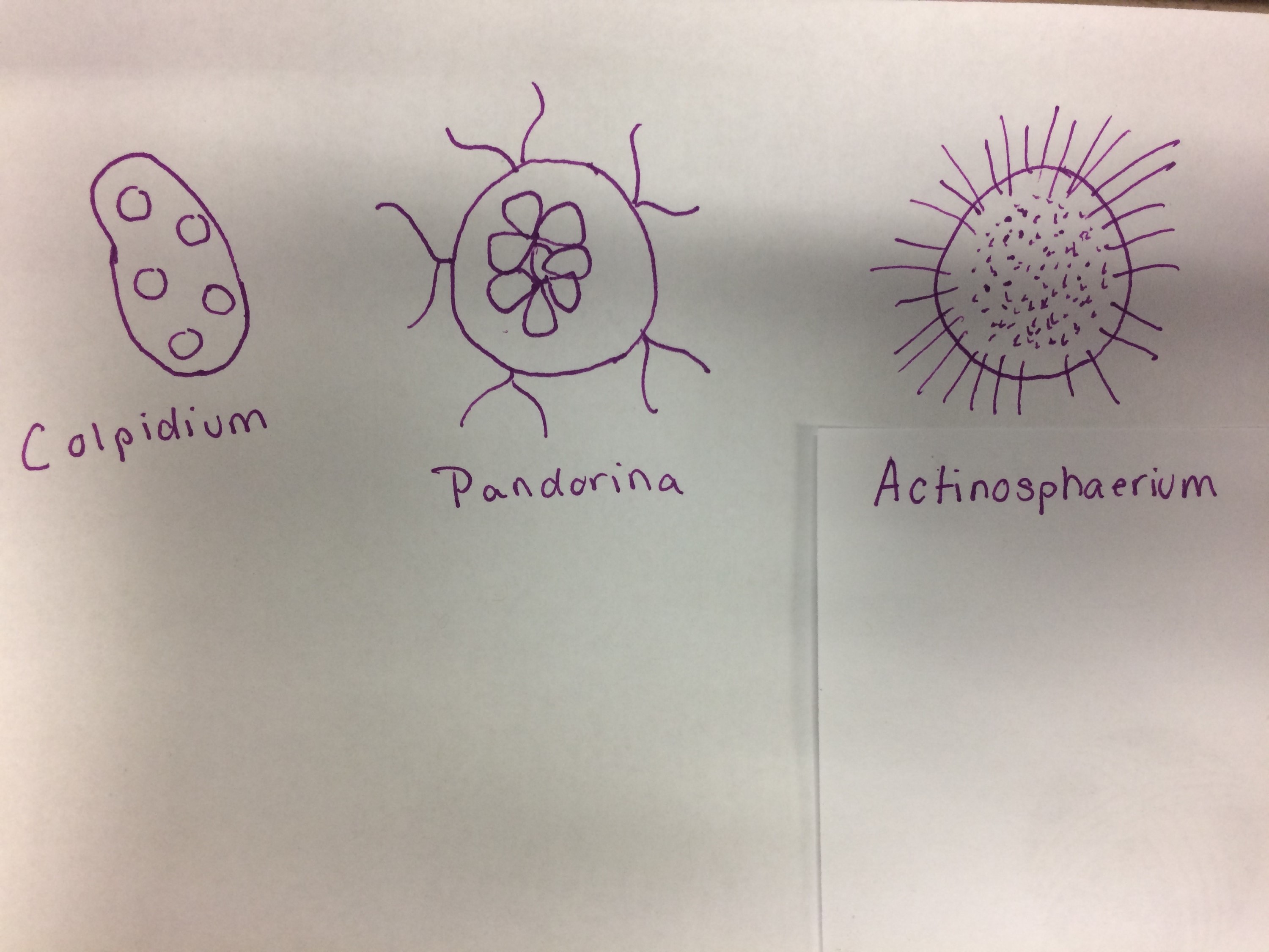 Results: The hay infusion was cloudy and had a white and green tint to the water. There was sediment at the bottom- it appeared as though there was a layer of sandy material. There were green, leafy particles at the top with a grimy film over part of it. There was a strong earthy odor to the substance. We were only able to identify three eukaryotes in the hay infusion. One of them was pandorina, one was colpidium, and the third was acetinosphaerium. There was numerous pandorina (50μm), a green algae, that was found at the top of the substance. They were very motile. There were several colpidium(30μm), a protozoa, found at both the top and bottom of the substance. Like pandorina, they were also motile. The last organism discovered was acitinosphaerium (25μm), another protozoa, found at the top of the hay infusion. The organism was very slow moving. Because the pandorina was an algae, it was able to photosynthesize, while the two other eukaryotes, being protozoa, were not able to.