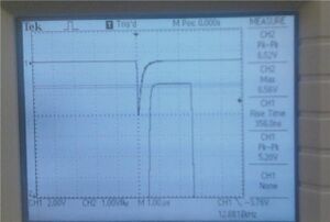 - To get the data we initially measured the voltage at the current distance we were at, which we designated as "0" in the spreadsheet in the Data section. We then pulled the LED out by 10cm and would then take another measurement. We repeated this until we got to 100cm from our initial starting point. At this point we extended the ruler out an extra centimeter and then pushed it back in to the same distance. We believed this to be necessary as to eliminate the chance of backlash, since the LED was attached to the meter stick by some means, and may have the ability to stay still for a little bit before it starts moving in the direction we were pushing. It is also important to note that, after each time we moved the LED, we rotated the PMT so that the signal we saw on the oscilloscope had the same value for each measurement. An example of this signal is given by the spike you see in Figure 4.