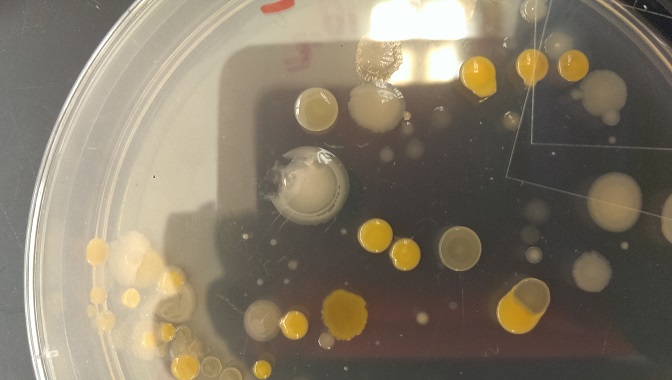 Materials and Methods- Samples were taken from two distinct niches of the culture, one from the top layer and the other from the bottom sediment. Then each distinct sample was put on a slide with proto-slow for observation. From each of the two slides three different species of organism were identified for a total of six different organisms. These organism were identified using a dichotomous key which was provided in class. After this the entire culture was shaken up to create uniform distribution.100 uLs of this solution was added to 10 mLs of broth. Then 100 uLs of this second solution was added to another 10 mLs of broth. This process was repeated two more times resulting in 4 solutions of varying concentration. The following solutions had concentrations of 1:100, 1:10,000, 1:1,000,000, and 1:100,000,000. 100 uLs of each solution was then platted onto labelled normal agar plates, and another 100 uLs of each solution was platted onto labelled tetracycline agar plates. Plates were inoculated using a glass spreader dipped in ethanol and passed through flame. And then incubated for next week’s lab.