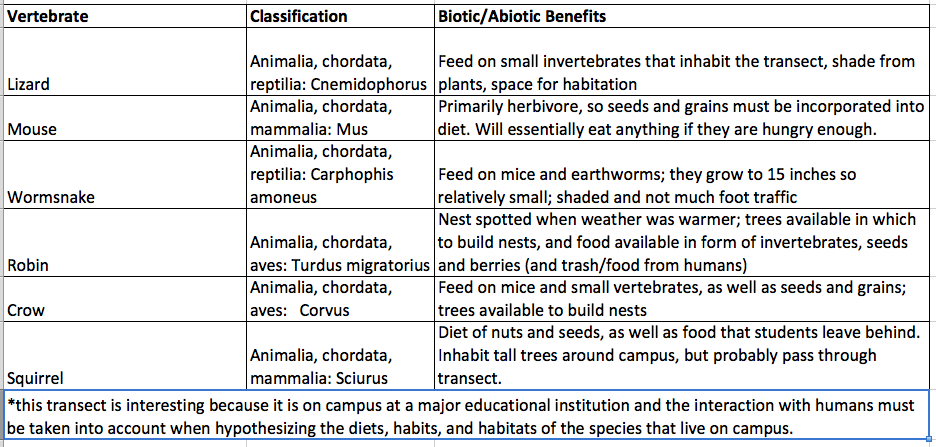 This lab incorporates invertebrates, vertebrates, and the web of organisms that inhabit the 20x20 transect on the AU campus. The hypothesis was confirmed to an extent, since a small spider and soil mites were found in the samples that were incorporated into the Burlese funnel setup, as well as a small millipede. This lab brought everything together, in that the invertebrates were observed and the types of vertebrates that would be present in the transect were hypothesized.