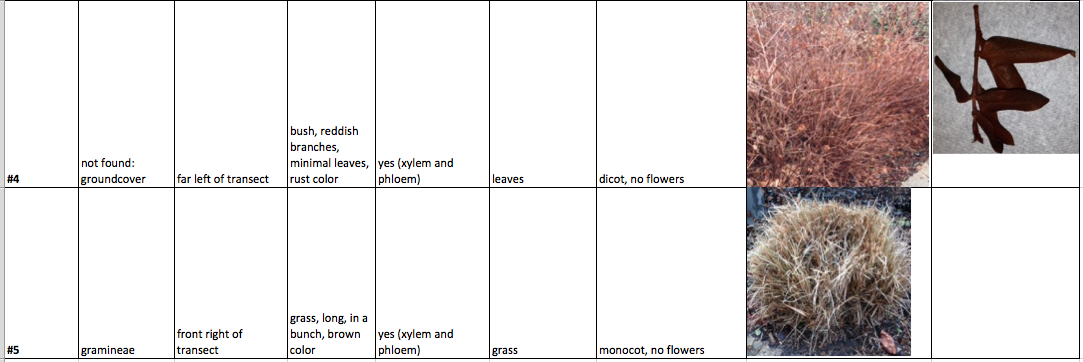 Only three out of the five plants in the transect were able to be appropriately categorized, which is probably due to the fact that the leaves are dead and it is difficult to identify a plant this way. Furthermore, the color and possible flowering plants on these specimens were not present, so all of the information needed to categorize them was not available. The vascularization portion of the lab was interesting because, firstly, it asserted the hypothesis that our plants were all vascular, and it also brought into perspective the variability of the plants in the transect. The construction of the Berlese funnel was a learning experience and the invertebrates present in the leaf litter sample, and therefore the ecosystem, will be interesting to observe next week.
