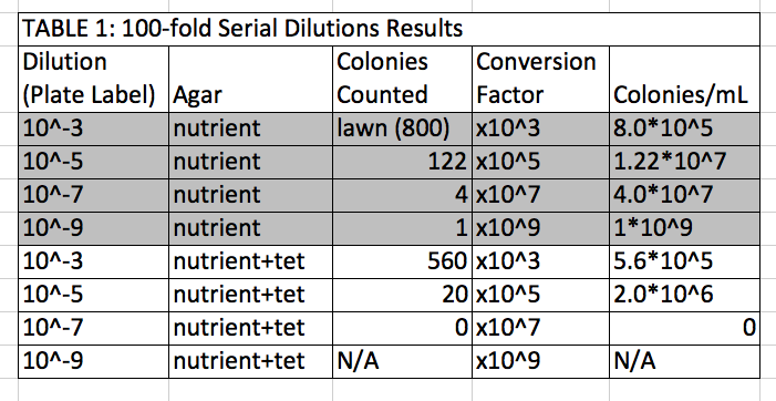 5. Make serial 100-fold dilutions of the culture in four nutrient agar and four agar plus tetracycline plates, which will be 10^-3, 10^-5, 10^-7, and 10^-9 dilutions.