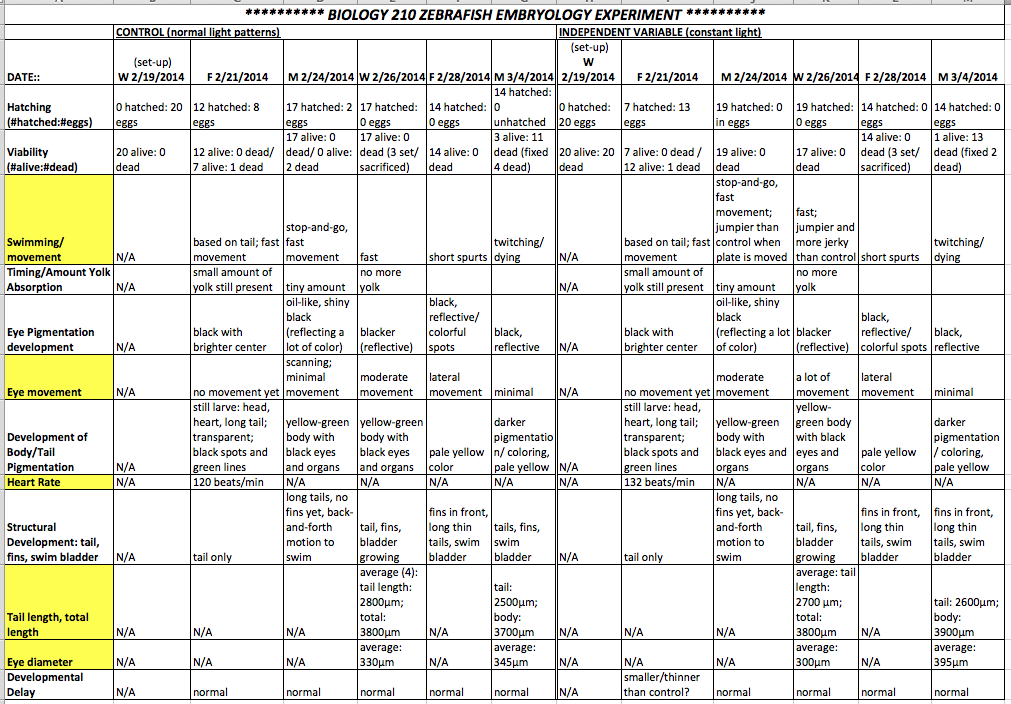 The above chart shows the raw data for the control and constant light exposure group. The N/A cells correspond to measurements not taken (for values of heart rate or tail/body length), since these were only taken when the fish were easy to measure and/or set in fermeldahyde. The dates the data was taken are along the top, and the characteristics that show notable differences between the control and independent variable group are highlighted in yellow.