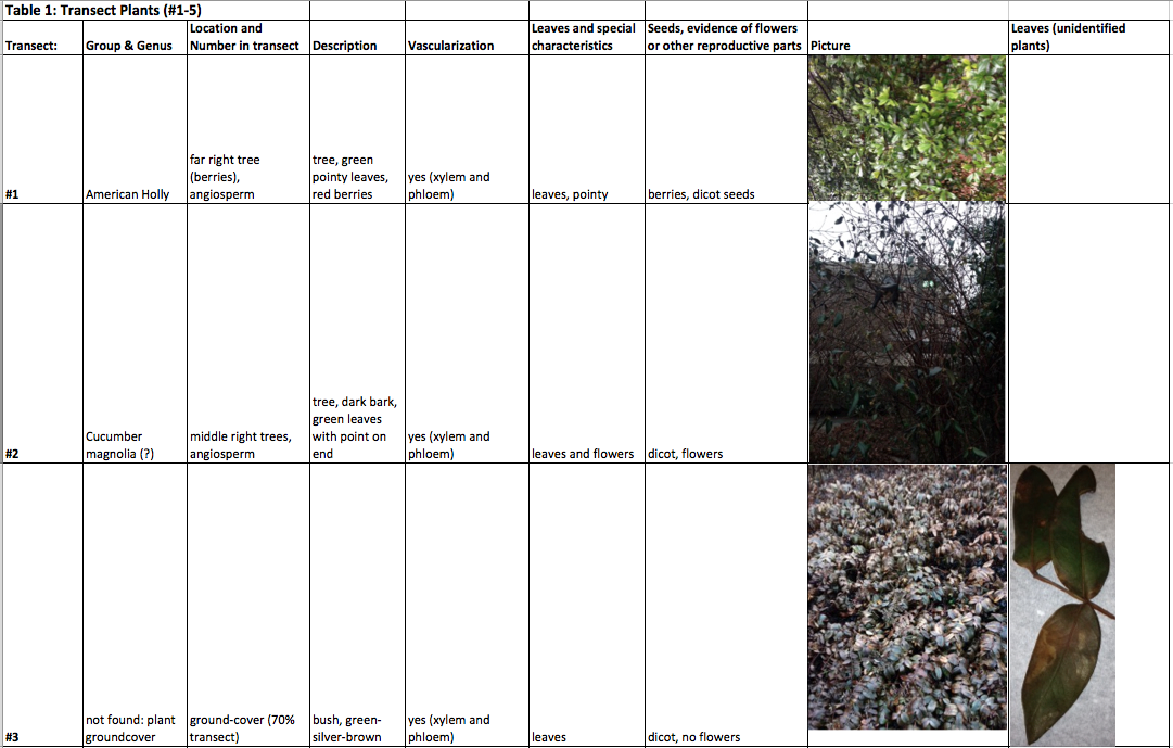 Objective: The objective of this experiment is to understand the characteristics and diversity of plants, and to appreciate the function and importance of fungi. The evolution of Bryophytes, Tracheophytes, and Angiosperms was explored, and the existence of these plant types in the AU transect was studied. The characteristics of a bryophyte moss and an angiosperm were observed, and five plant samples from the transect were collected and categorized using a dichotomous key. The plant types were examined in terms of three general features: (1) vascularization, (2) specialized structures, and (3) reproduction. A hypothesis for the types of plants that will be found in the transect is: all three types of plants will be present in the transect, but the most plentiful will be the angiosperms. Because we are studying and identifying the plants in the AU transect , we will have a better idea of the interaction between all of the organisms present in the 20x20ft ecosystem.