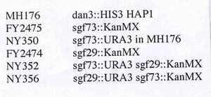 | Plate type | Temp | FY3 (~wt) | MH176 (~wt) | FY2475 (sgf73::KanMX) | NY350 (sgf73::URA3 in MH176) | FY2474 (sgf29::KanMX) | FY356 (sgf29::URA3 sgf73::KanMX) | comments | |