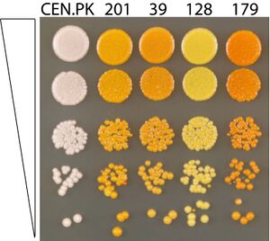 So clearly something doesn't quite jive between what is in the figure and the genotypes of the strains we have in the lab. But in any case, we do know for sure that all 4 strains do indeed contain at least one copy of crtYB/I/E - they all PCR amplify using primers specific for these genes. I've also attached a figure with the colours of the four strains compared to CEN.PK.