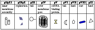 | VI | 112 | phage tail protein (5 copies) | packages with pIII |