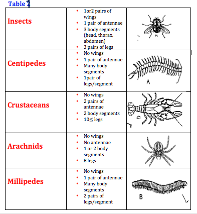 The five arthropods are ,in order: Insects, centipedes, crustaceans, arachnids, and millipedes. (Table 1)