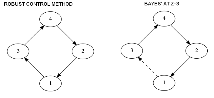 This time we none of the algorithms guessed the true structure, so we chose to display the first and 5th AICc scores for the robust control method. For the Bayesian method we chose z=3 and z=5 again. For detailed values of AICc scores in the robust control method, click here.