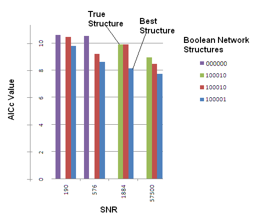 In this particular trial, the Robust Control Method was capable of recovering the correct structure in the third highest AICc score for SNRs of 57488 and 1885. For lower SNR values, it did not succeed in recovering network structure.