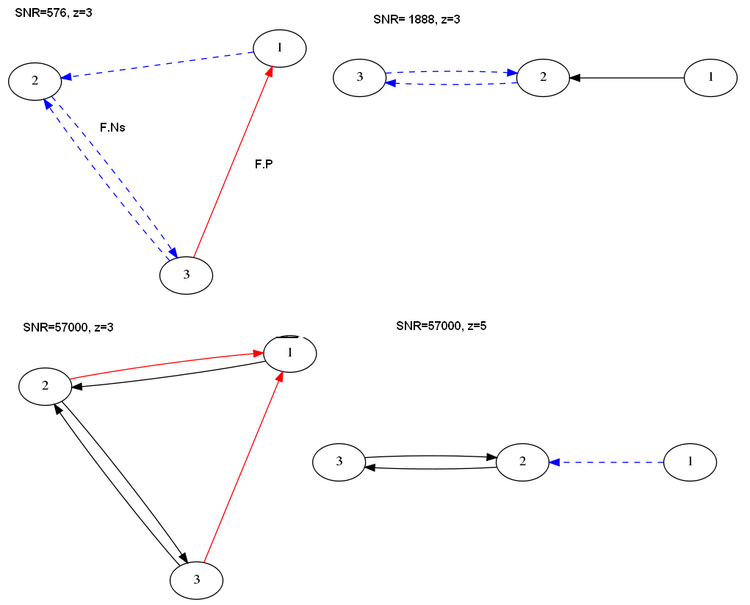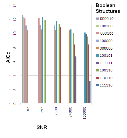 For the highest two values of signal to noise ratio used in this experiment, we obtained the networks below. This time, none of them recovered the correct answer, so we show the five best scoring structures, ranked again according to AICc: