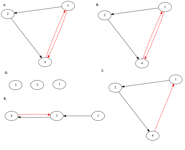 Figure :A.Best candidate structure. B. Second best candidate structure C. Third best candidate structure. D. 4th Best Candidate Structure E. 5th Best Candidate Structure For SNRs=1e5.The top five candidates were chosen, according to best AICc scores. The legend of arrows signifies the following:Black arrow: Correctly identified connection.Dashed blue arrow: False negative (missed connection)Red arrow: False positive (spurious connection)