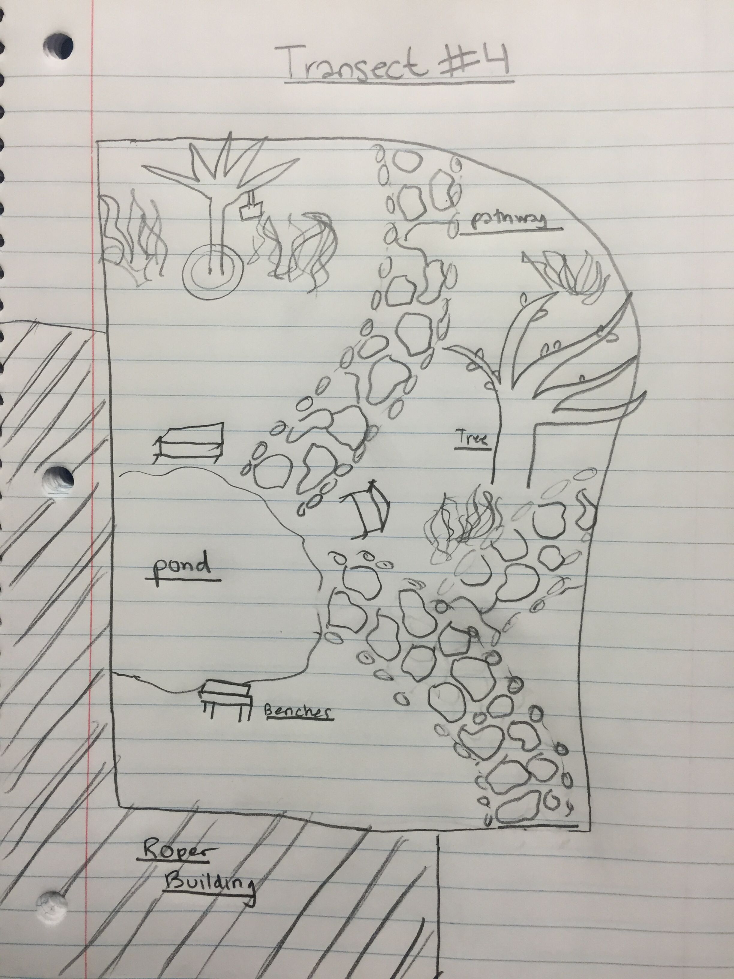 This transect is considered a certified wildlife habitat. It is home to a multitude of organisms such as squirrels, different types of birds, trees, and various bushes. Some factors that affect what organisms inhabit the area include human intereaction due to the transect being right next to the Roper building as well as the artificial light emitted from the building. The transect has a small, man-made pond in the center covered by a fence. We suspect that it is home to some bugs and other organisms in other seasons. All of the factors, abiotic and biotic offer either shelter, food, and protection.