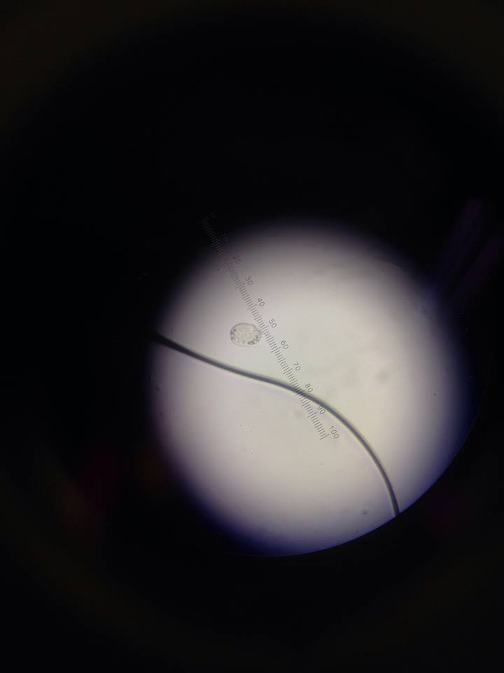 Eye diameter: 28 micrometers; only one eye observable; hole in head where other eye should be